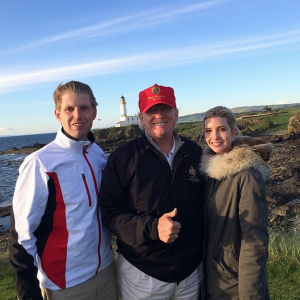 Trump ásamt syni sínum Eric og dóttur sinni Ivönku, sem bæði eru miklir kylfingar.