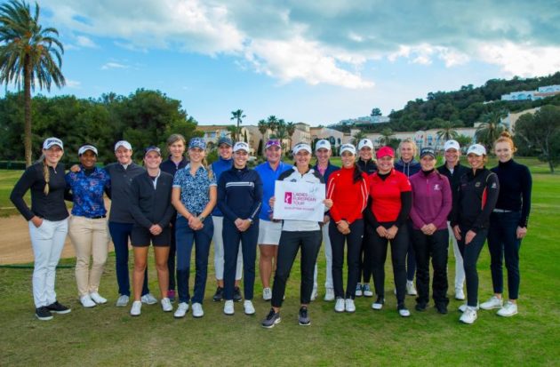 Í aðalmyndaglugga: Þær 19, sem léku á samtals 3 yfir pari eða betra á lokaúrtökumótinu og komust á LET. Á myndina vantar Monique Smit. Guðrún Brá er í fyrstu röð lengst til hægri í fjólubláum jakka. Mynd: LET