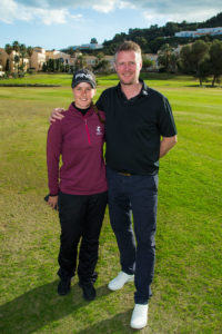 Í aðalmyndaglugga: Guðrún Brá ásamt föður sínum Björgvini Sigurbergssyni þegar kortið og keppnisréttur á LET 2020 var höfn. Mynd: Tristan Jones/LET.