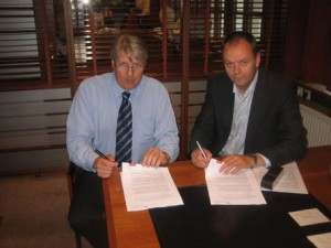 Kjartan  (t.v.) er útibússtjóri Arion banka í Stykkishólmi.  Hér við undirskrift samninga. Mynd: visir.is