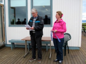 Kjartan og Erna hjá GMS að afhenda verðlaun á Áskorendamótaröðinni. Mynd: Golf 1