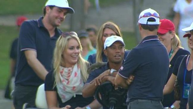 Það sem fyndnast við viðureignina kom í raun ekki fyrr en verið var að fagna nýjustu hetjudáð Tiger (og Kuchar) þegar kæresta Tiger, Lindsey Vonn kynnti hann fyrir Sammy, íkorna sem aðstoðarfyrirliði liðs Bandaríkjanna Davis Love fann við 2. holu og keyrði um völlinnn með honum sem lukkudýr.