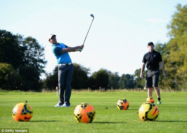 Meðan að Rory lék með Nike kylfum sínum, sem hann hefir verið að venjast allt árið, lék Rooney með Nike Ordem fótbolta.