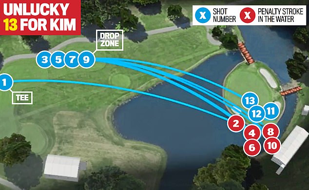 Kim fór við það úr samtals 5 yfir pari, í 15 yfir par á aðeins 1 holu. Bolti hans fór 5 sinnum í vatn og hann fékk vítahögg í hvert sinn fyrir og þurfti síðan 3 högg á flöt til þess að koma boltanum niður.